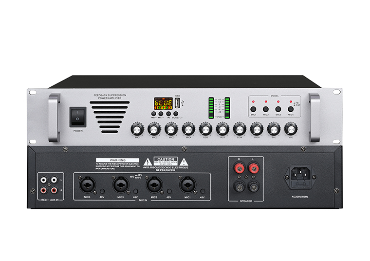 KM-8300反馈抑制功率放大器技术参数:1 供电方式: AC220V-230V,50 60Hz2 四路幻象供电话筒平衡输入3 每路话筒音量独立调节4 一